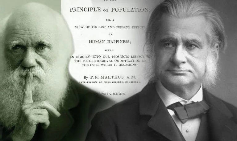 Despite his profound dislike for the British Empire’s high priest of population control Thomas Malthus, Karl Marx appears to have not recognized the core Malthusian worldview embedded in Charles Darwin’s system, which Darwin himself admitted took direct inspiration from Malthus’ 1799 theories on population. In his Autobiography, Darwin writes: