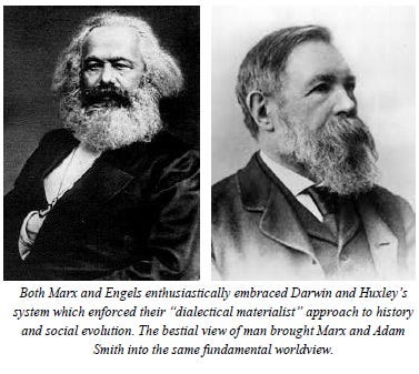 “Huxley became the most popular lecturer in what was known as the “workingman’s lectures.” His lectures on science deeply impacted the Socialists, the Communists, the Labor Movement, as well as the Anarchists. The cadre of these movements were all indoctrinated into the “materialist ape origins” of the human species. This included Karl Marx and especially Frederick Engels who totally embraced Huxley and his circle.