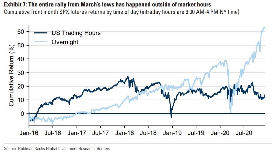We study how the excess market return depends on the time of the day using E-mini S&P 500 futures actively traded for almost 24 hours. Strikingly, four hour