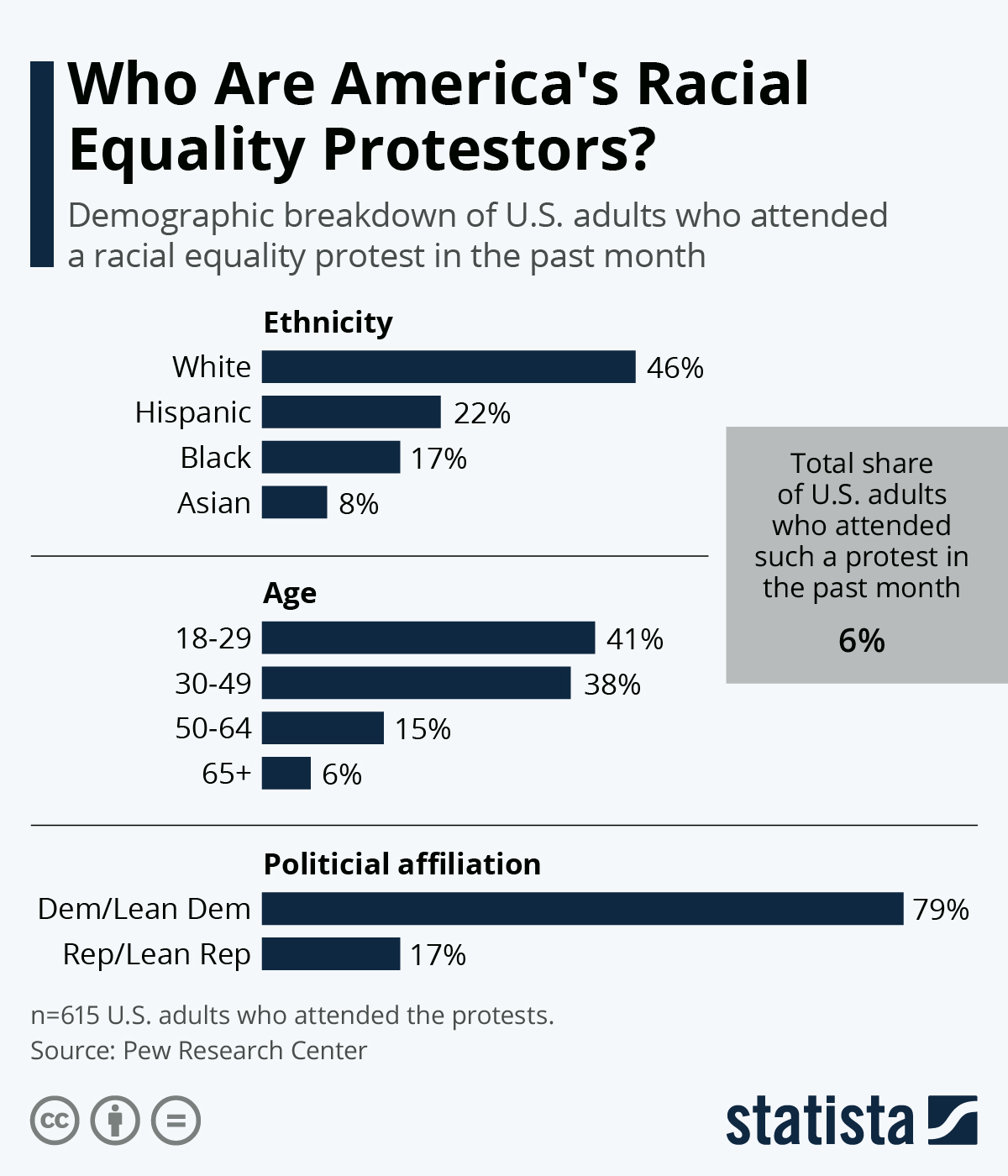 615 of Pew’s respondents attended a such protest or rally and 46 percent of that total were White, 22 percent were Hispanic, 17 percent were Black and 8 percent were Asian.